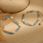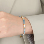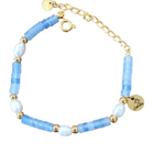 This elegant blue beaded bracelet is crafted from high-quality glass beads, freshwater pearls and 18k gold plating, ensuring a durable and long-lasting accessory for daily wear.